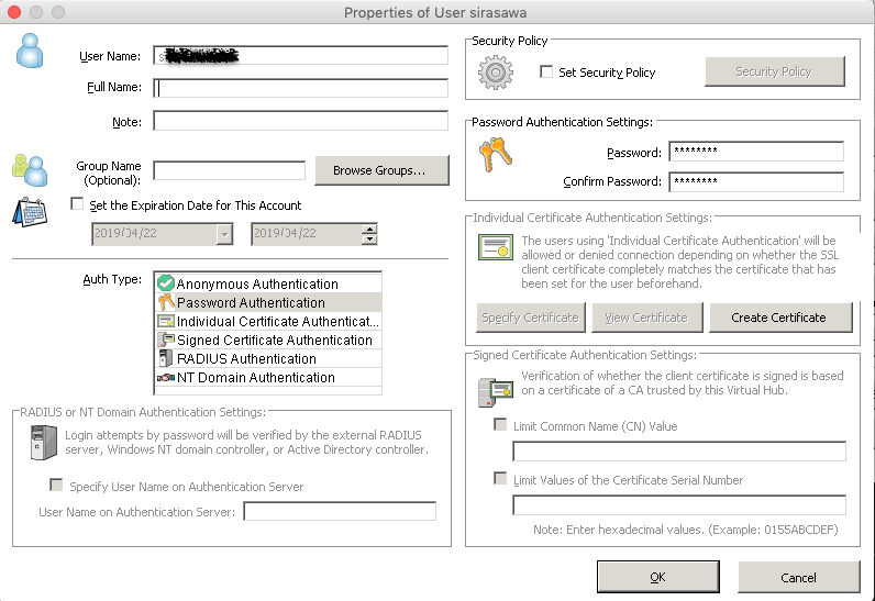 - 接続先のVPNサーバで設定したユーザとパスワードを設定して、OKをクリック。